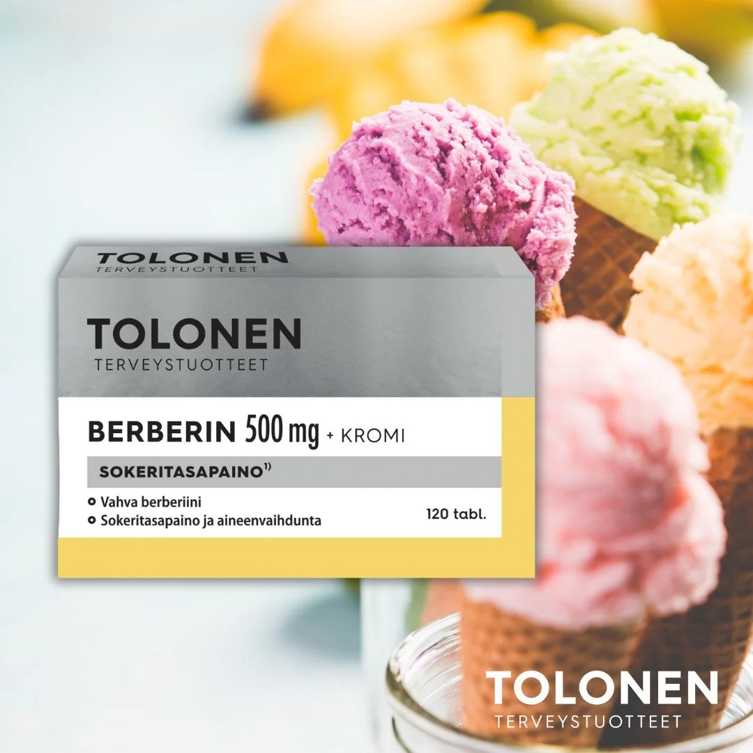 Tolonen Berberin 500 mg + Kromi auttaa ylläpitämään verensokeritasapainoa ja edistää normaalia aineenvaihduntaa. Berberiini on tunnettu jo yli 3000 vuoden ajan. Tolonen-valmisteen berberiini valmistetaan Berberis aristata -kasvin juuresta. Suositeltu vuorokausiannos sisältää 1000-1500 mg berberiiniä sekä 34-51 µg kromia. Kromi edistää veren glukoositasojen pysymistä normaalina ja normaalia makroravintoaineiden aineenvaihduntaa.